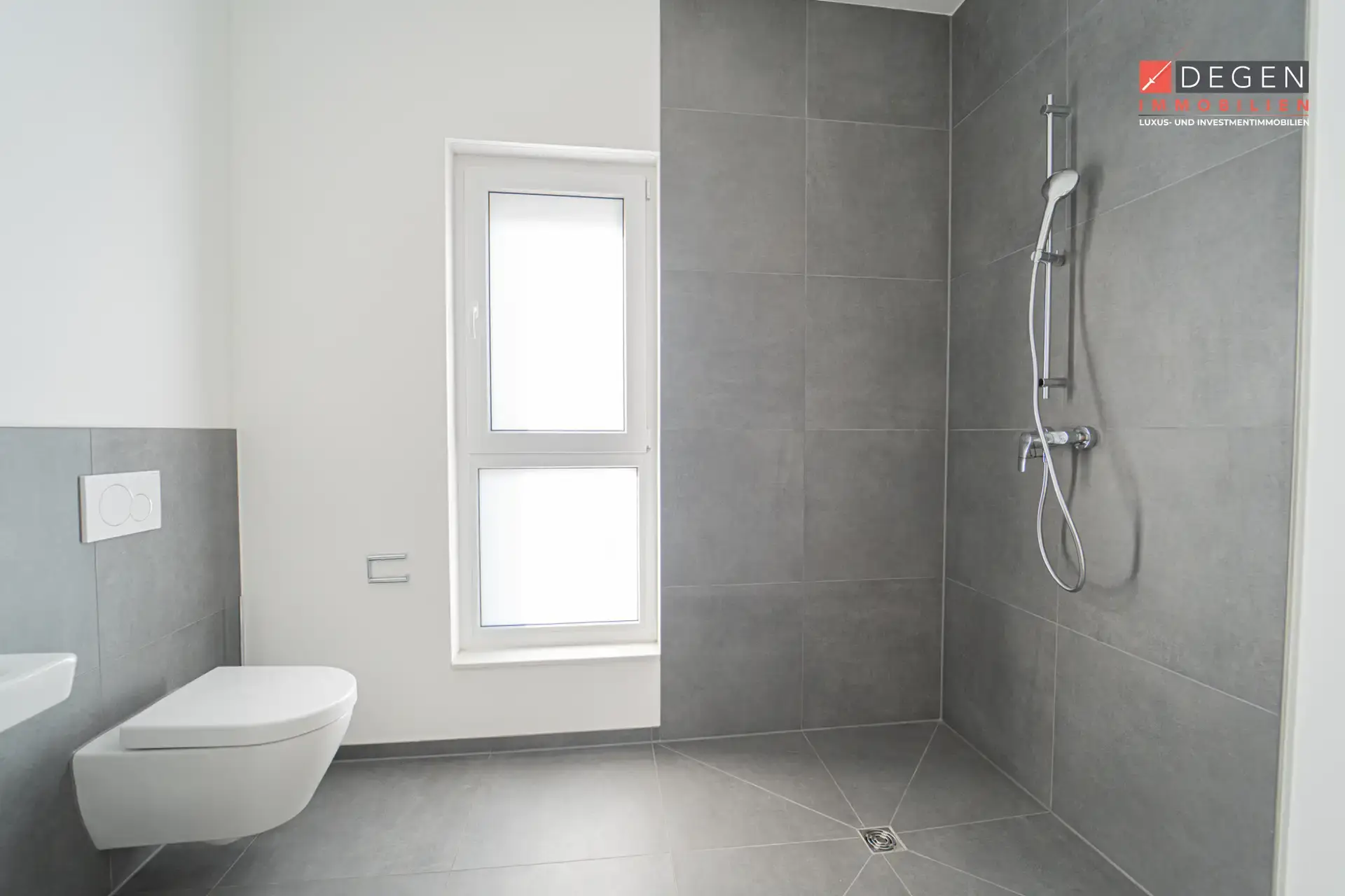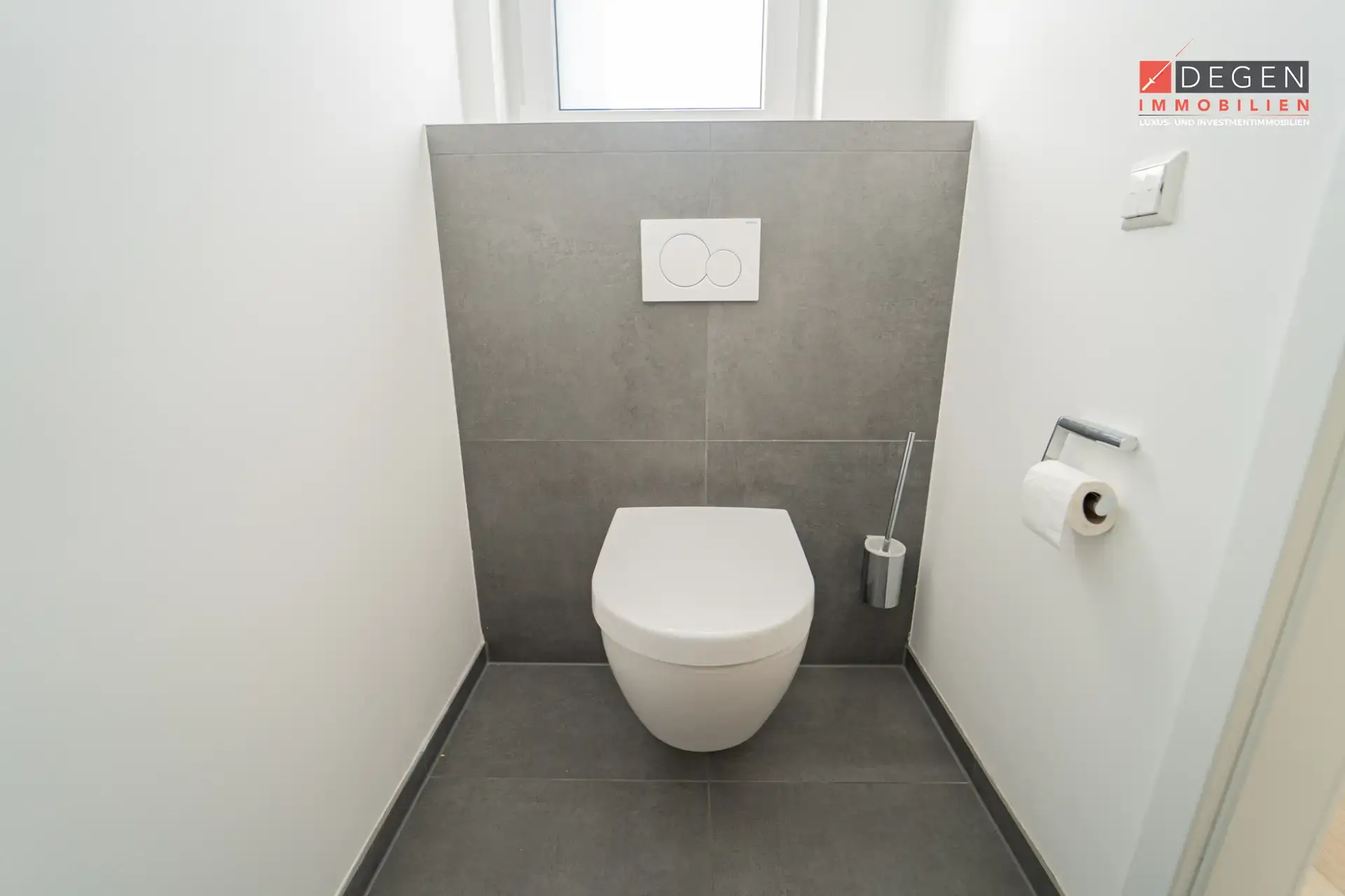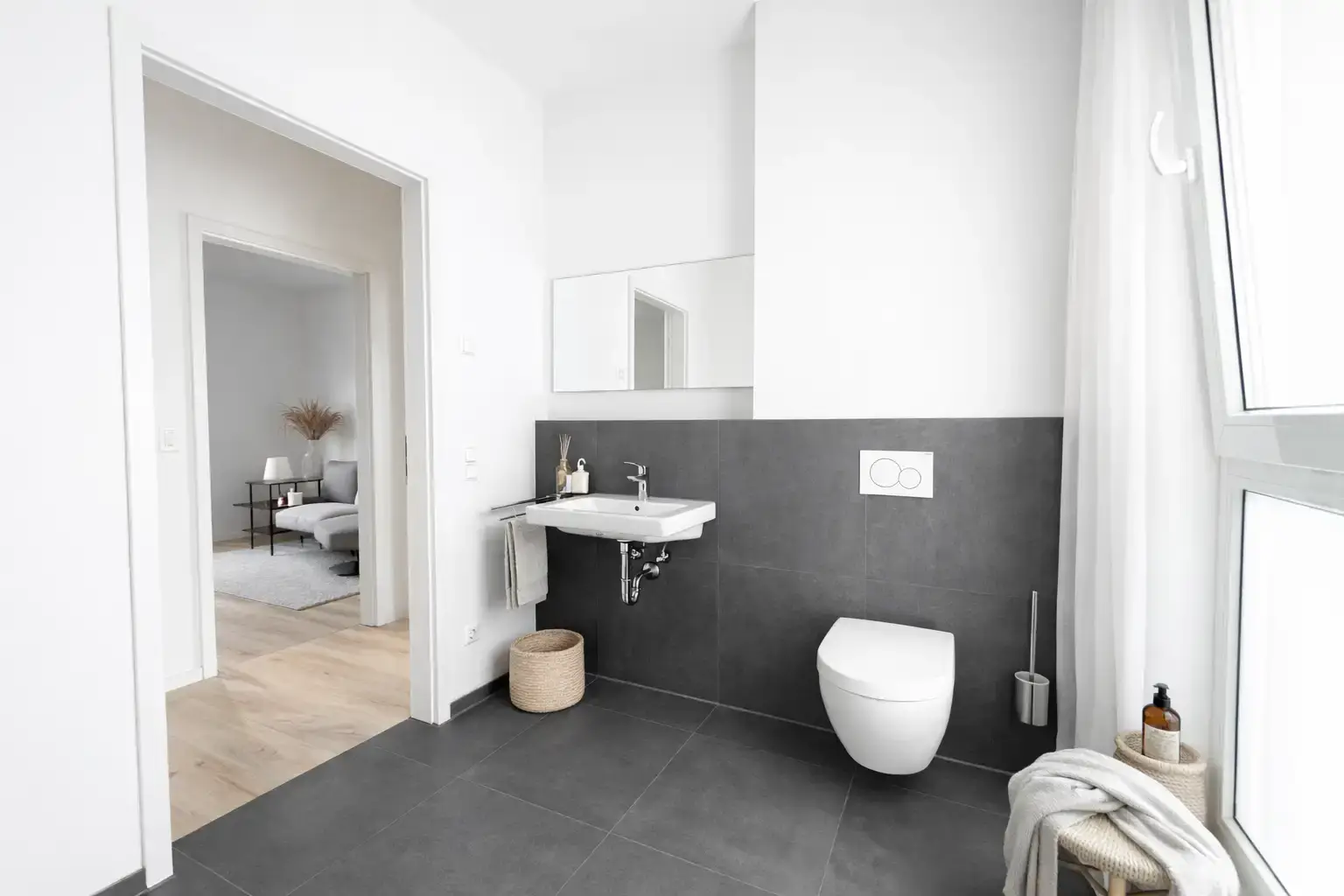 Das moderne Badezimmer ist mit einer bodengleichen Dusche, hochwertigen Armaturen und geschmackvoller Ausstattung versehen. Ergänzend steht ein separates Gäste-WC zur Verfügung.